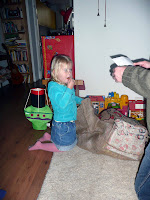 Het einde van de zak met cadeautjes komt in zicht. Bo verdwijnt bijna helemaal in de zak, op zoek naar de laatste paar. Zo'n grappig gezicht!